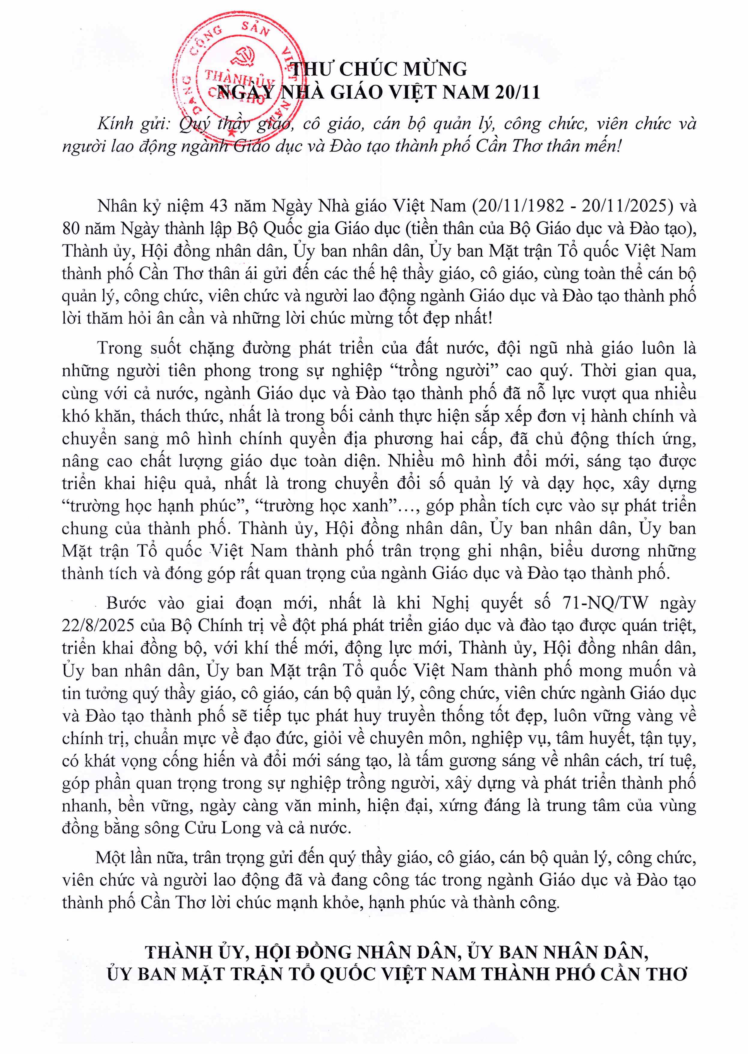 Thư chúc mừng của Thành Ủy Cần Thơ nhân ngày Nhà giáo Việt Nam 20/11