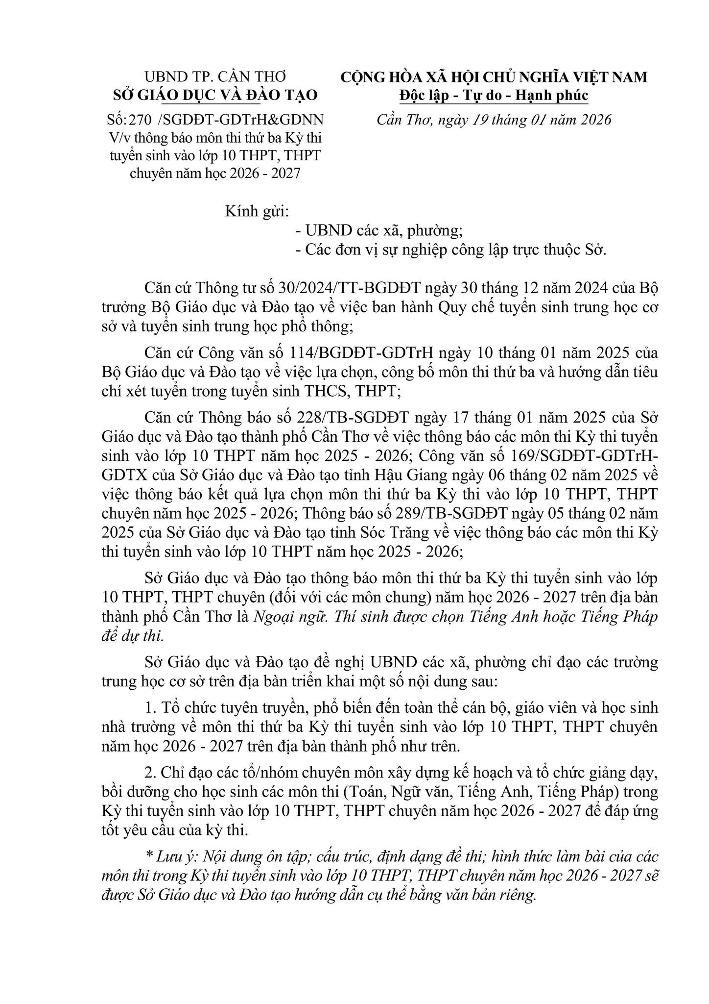 Các môn thi tuyển sinh 10 - Năm học 2026-2027
